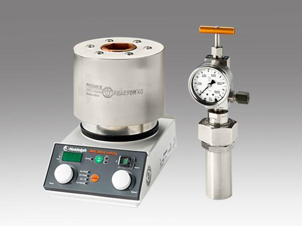 This Premex Vivor is a small reactor which can be placed into an oven. We can supply it with a mantle for use in combination with an IKA heating and stirring plate which allows to stir the content with a magnetic stirring bar. The connections on the lid can be adapted to your needs. On the photo a SITEC three-way valve + manometer is shown. We also supply this reactor with a magnetic stirring coupling for use with different type of impellors: see Premex Apart.